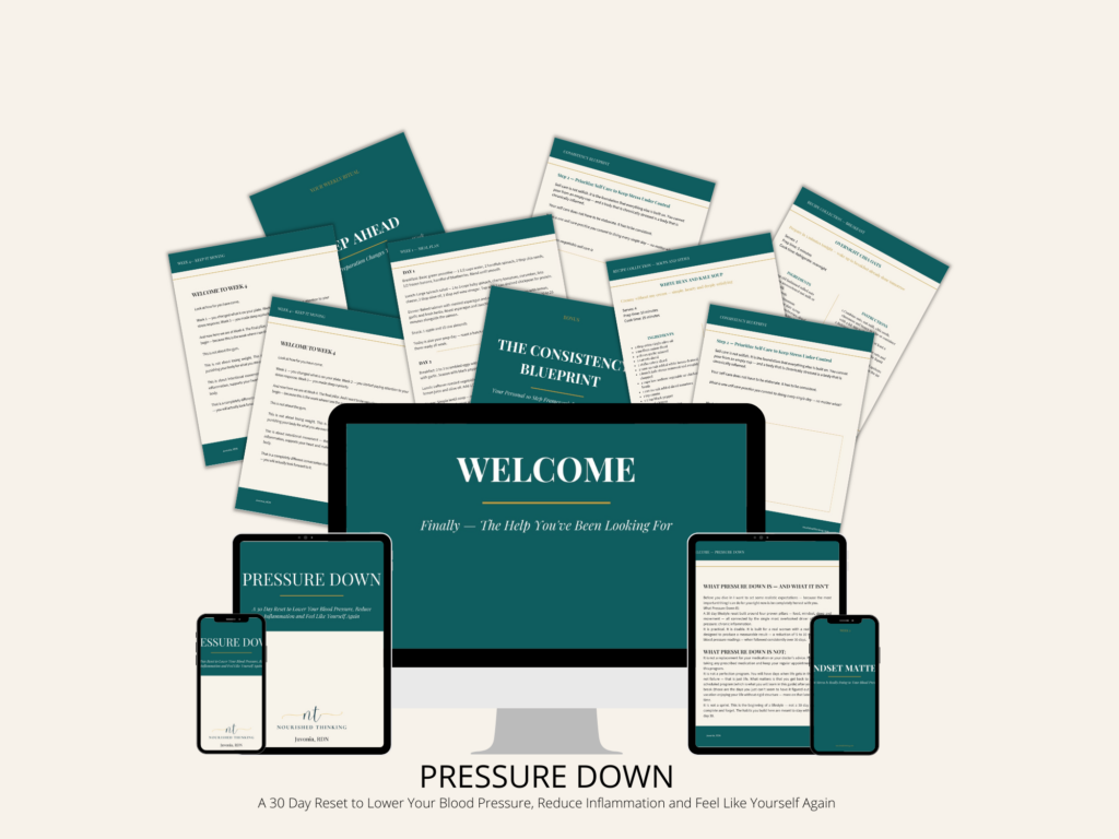 Pressure Down is a complete 30 day lifestyle reset designed specifically for women managing high blood pressure. It covers all four pillars — food, mindset, sleep and movement — all connected by the inflammation framework you just read about. And it comes with a complete 30 day meal plan, 30 blood pressure friendly recipes, four weekly grocery lists and a bonus Consistency Blueprint to help you make everything last long after Day 30.